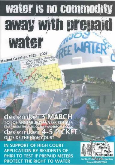 This offset litho poster was produced by the Coalition against Water Privatisation (CAWP) and the text reads: "Water is no commodity : Away with prepaid water : In support of High Court application by residents of Phiri to test if prepaid meters protect the right to water". As part of the 'Phiri Water Wars' - which saw residents in Phiri in Soweto engaging in an intense battle with the City of Johannesburg/Joburg Water agaisnt the introduction of prepaid water meters - residents of Phiri, through the Coalition against Water Privatisation (CAWP), instituted a constitutional rights legal challenge in 2005. This poster was to mobilise CAWP members and other communities to participate in a march against Joburg Water in support of the case which was being heard in the High Court. Although the outcome of the legal case in the High Court saw prepaid meters being declared unconstitutional and the City of Johanneburg being instructed to provide additional 'free water', subsequent rulings by the Supreme Court of Appeals and then the Constitutional Court over-turned the High Court decision.