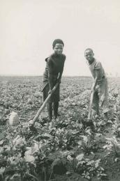 This black and white photograph of a young boy and girl working in a beetroot field on a farm in springs was taken by an unidentified photographer. Date unknown. This photograph was digitised by Africa Media Online (AMO) in 2009. |