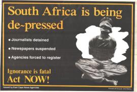 This poster is an offset litho in black and yellow, produced by the East Cape News Agencies, Eastern Cape. This poster called journalists to oppose state attempts to muzzle the press. The text reads “South Africa is being de-pressed: Ignorance is fatal : Act NOW!” Digitised by Specialised Archival Solutions in 2009. Reproduced in "Images of Defiance: South African Resistance posters in the 1980s" on page 176 (number 325) of the 1991 SAHA / Ravan Press edition and the 2004 SAHA / STE Publishers edition. |