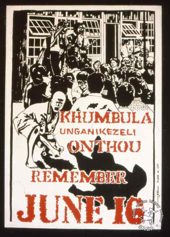 This poster is silkscreened black and red, produced in Cape Town. This poster recalls the significance of 16 June in English, Xhosa and Afrikaans. The text reads: "KHUMBULA UNGANIKEZELI ONTHOU REMEMBER JUNE 16". Digitised by Specialised Archival Solutions in 2009. Reproduced in "Images of Defiance: South African Resistance posters in the 1980s" on page 108 (number 195) of the 1991 SAHA / Ravan Press edition and the 2004 SAHA / STE Publishers edition. It is also included in SAHA virtual exhibition - 'The Future is Ours: Commemorating Youth in the Struggle' |