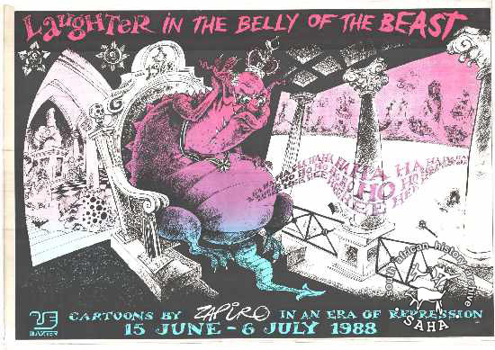 This poster is an offset litho in black, blue and pink, drawn by Zapiro and produced by The Baxter Theatre, Cape Town . This poster represents repression under a monstrous PW Botha, which failed to silence the laughter of the people. The text reads: "Laughter in the belly of the beast". Reproduced in "Images of Defiance: South African Resistance posters in the 1980s" on page 169 (number 305) of the 1991 SAHA / Ravan Press edition and the 2004 SAHA / STE Publishers edition. |
