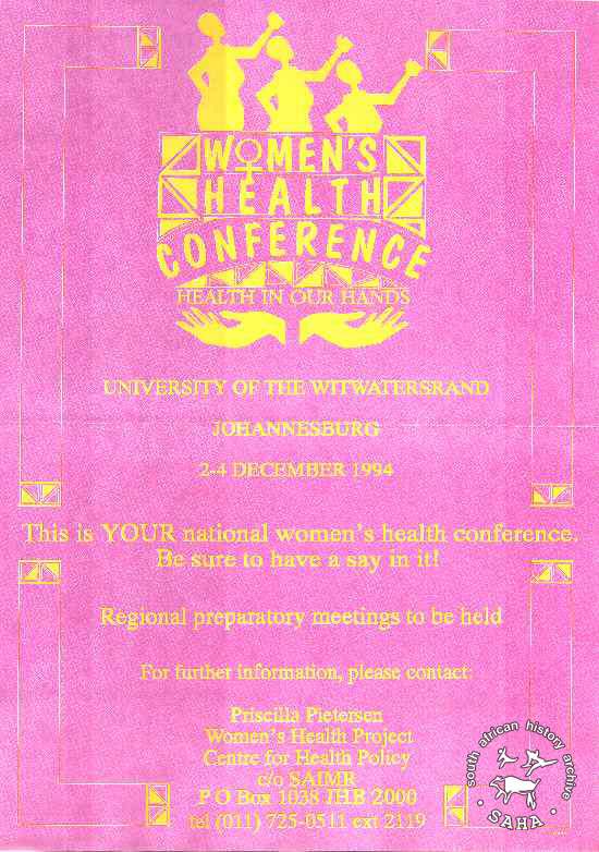 This poster is an offset litho in purple and yellow. It announces the Women's Health Conference held at the University of Witwatersrand, Johannesburg in December 1994.