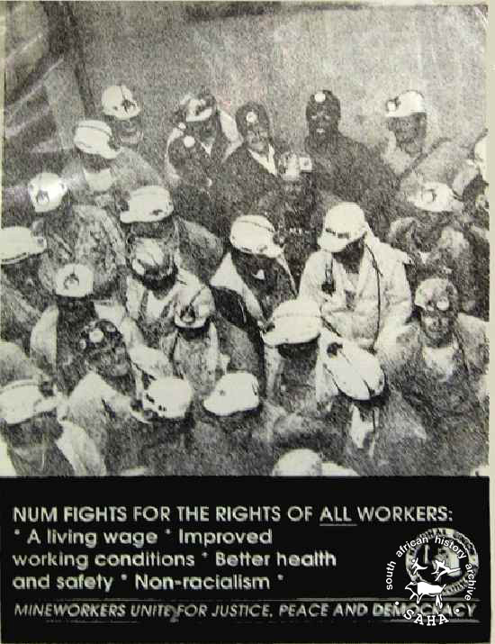 This is a silkscreened poster in black and white with picture of workers in a shaft dealing with the mineworkers fight for unity, justice, peace and democracy for all workers. |