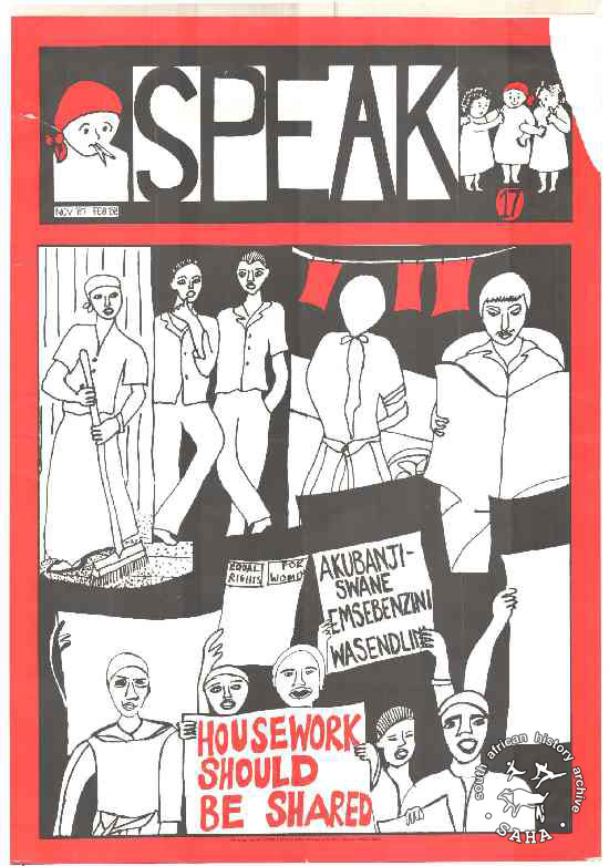 This poster is an offset litho in black, white and red. The image is drawings of women doing housework and holding up signs. The text reads: "SPEAK : EQUAL RIGHTS FOR WOMEN: AKUBANJISWANE EMSEBENZINI WASENDLINI : HOUSEWORK SHOULD BE SHARED".
