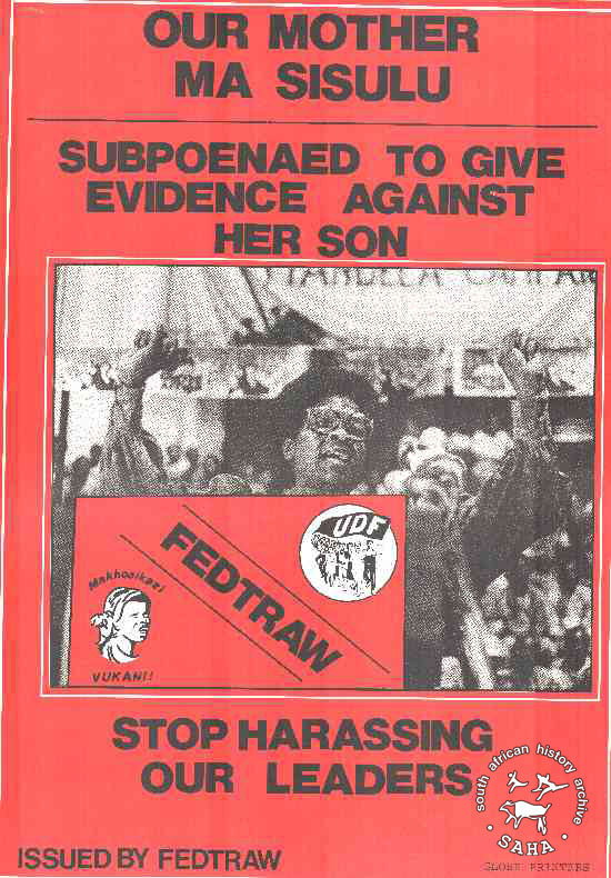 OUR MOTHER MA SISULU : SUBPOENAED TO GIVE EVIDENCE AGAINST HER SON : STOP HARASSING OUR LEADERS |