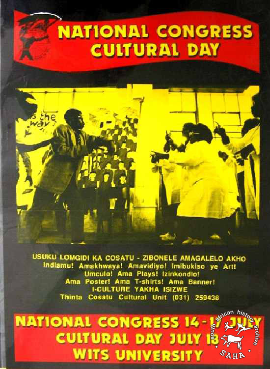 This poster is an offset litho in black, red and yellow, produced by COSATU, Johannesburg. This poster depicts the importance of culture to workers at their cultural day. The text reads “National Congress Cultural Day” Digitised by Specialised Archival Solutions in 2009. Reproduced in "Images of Defiance: South African Resistance posters in the 1980s" on page 171 (number 313) of the 1991 SAHA / Ravan Press edition and the 2004 SAHA / STE Publishers edition. It also appears on page 176 of “Red on Black: The Story of the South African Poster Movement”, SAHA / STE Publishers, 2007, as well as the SAHA virtual exhibition - 'Hlanganani Basebenzi: Commemorating South Africa's Labour Movement'. |