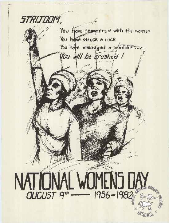 This poster is silkscreened in black on white; includes a drawing. Text reads: "NATIONAL WOMENS DAY".