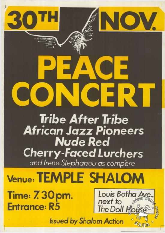 This poster is silkscreened in black and yellow on white and was issued by Shalom Action, date unknown. The text reads: "30TH NOV. : PEACE CONCERT : Tribe After Tribe : African Jazz Pioneers : Nude Red : Cherry-Faced Lurchers and Irene Stephanou as compère." This poster was digitised by Specialised Archival Solutions in 2009. Included in the SAHA virtual exhibition 'What you won't hear on the radio' developed to mark the 30th birthday of Shifty Records and the 25th anniversary of the Voëlvry tour. |