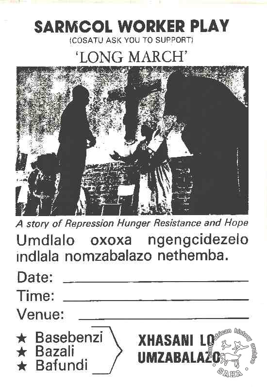 SARMCOL WORKER PLAY; (COSATU ASK YOU TO SUPPORT): 'LONG MARCH' |