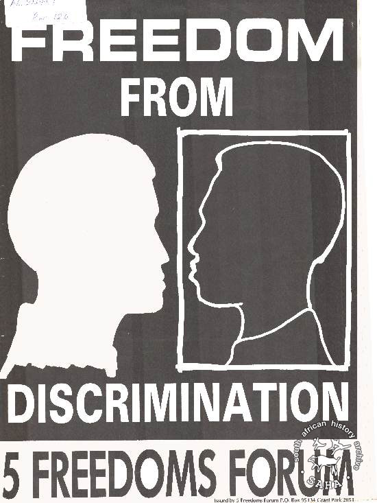 This is an offset litho poster in white on black dealing with freedom from discrimination. |