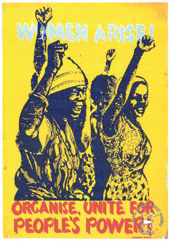 This poster is an offset litho in red and black on yellow. It features an image of women with raised fists. The text reads: "WOMEN ARISE: ORGANISE, UNITE FOR PEOPLE'S POWER! : ngwedi graphics - MEDU ARTS".