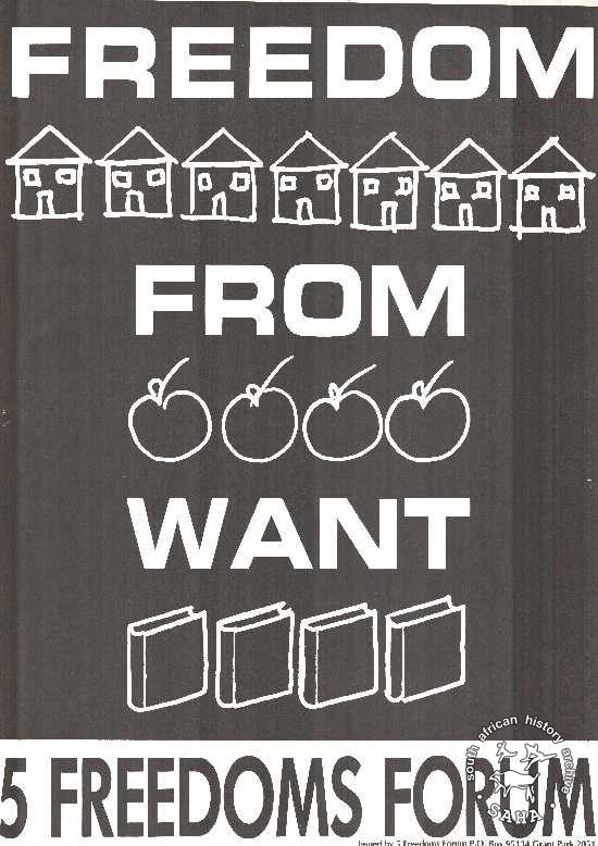 This poster is an offset litho in black, produced by the FFF, Johannesburg. This poster refers to the demands of the FFF, specifically the "Freedom from want". The text reads “FREEDOM FROM WANT”Digitised by Specialised Archival Solutions in 2009. Reproduced in "Images of Defiance: South African Resistance posters in the 1980s" on page 40 (number 64) of the 1991 SAHA / Ravan Press edition and the 2004 SAHA / STE Publishers edition. It also appears on page 190 of “Red on Black: The Story of the South African Poster Movement”, SAHA / STE Publishers, 2007 |