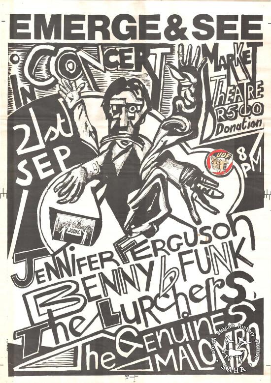 This poster is silkscreened in black and white and was issued by the United Democratic Front (UDF) and the Johannesburg Democratic Action Committee (JODAC) for a music concert at the Market Theatre on 21 September, circa 1985. The text reads: EMERGE AND SEE IN CONCERT : 21 SEP : JENNIFER FERGUSON : BENNY FUNK : THE LURCHERS : THE GENUINES : MALOMBO". This poster was digitised by Specialised Archival Solutions in 2009. Included in the SAHA physical and virtual exhibitions 'What you won't hear on the radio' developed to mark the 30th birthday of Shifty Records and the 25th anniversary of the Voƫlvry tour. |