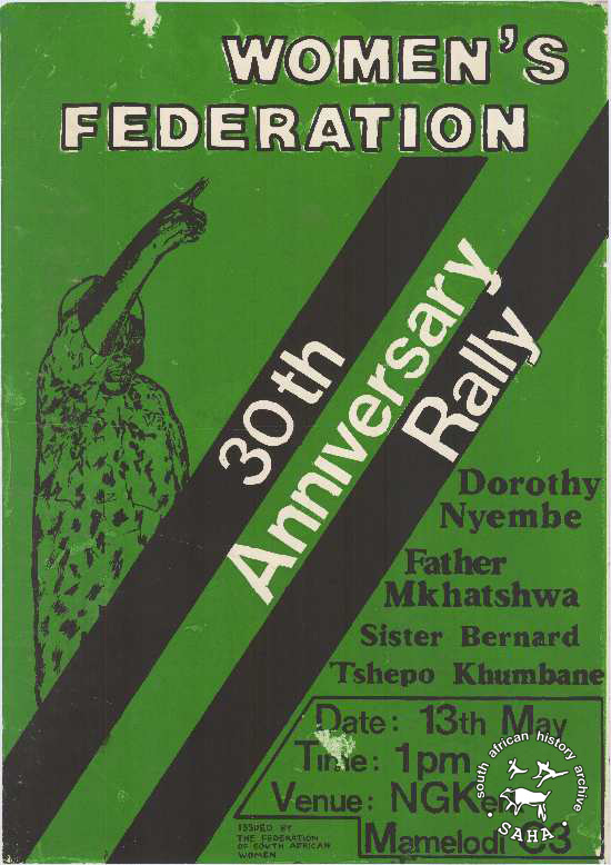 This poster is silkscreened in black, green and white. The poster has an drawing of a woman pointing upwards. The text reads: "WOMEN'S FEDERATION: 30th Anniversary Rally : Dorothy : Nyembe : Father Mkhatshwa : Sister Bernard : Tshepo Khumbane : Date: 13 May : Time: 1pm : Venue: NGKerk " Mamelodi C3 : ISSUED BY THE FEDERATION OF SOUTH AFRICAN WOMEN".