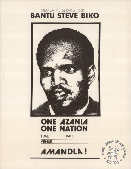 This offset litho poster in black and white was issued by the Azanian People's Organisation (AZAPO), date unknown. The text reads: "MEMORIAL SERVICE FOR BANTU STEVE BIKO : ONE AZANIA ONE NATION : AMANDLA!". This poster was digitised by Specialised Archival Solutions in 2009.