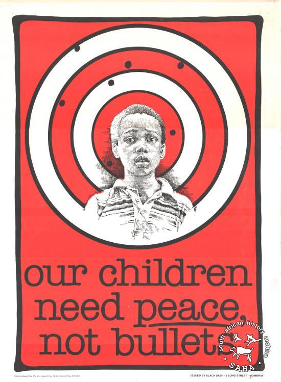 This is an offset litho poster in black and red issued by the Black Sash in 1986 in an appeal to the South African government for the protection of children. The text reads: "our children need peace, not bullets". This poster was digitised by Specialised Archival Solutions in 2009.