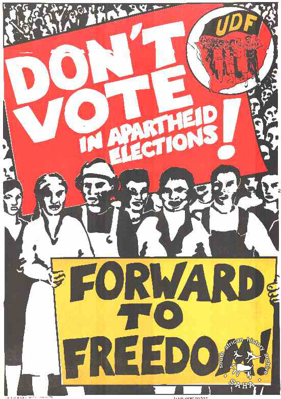 The UDF called on coloured and Indian South Africans to refuse to vote in the tricameral parliament elections.This poster refers to the UDF and how it was formed to oppose the tri-cameral system and all apartheid elections.The text reads “Don't vote in apartheid elections!; Forward to freedom.”Digitised by Specialised Archival Solutions in 2009. Reproduced in "Images of Defiance: South African Resistance posters in the 1980s" on page 33 (number 50) of the 1991 SAHA / Ravan Press edition and the 2004 SAHA / STE Publishers edition. It also appears on page 128 of “Red on Black: The Story of the South African Poster Movement”, SAHA / STE Publishers, 2007. |