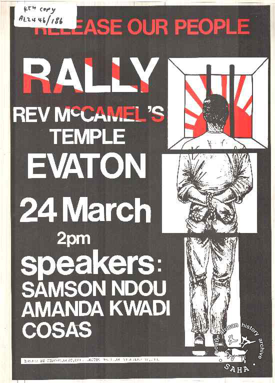 This poster is an offset litho in black and red, produced by DESCOM, DPSC and the UDF in 1985. This poster was produced to advertise a rally in Evaton, a Vaal Triangle township. The text reads: "RELEASE OUR PEOPLE: RALLY". This poster was digitised by Specialised Archival Solutions in 2009. Reproduced in "Images of Defiance: South African Resistance posters in the 1980s" on page 150 (number 274) of the 1991 SAHA / Ravan Press edition and the 2004 SAHA / STE Publishers edition. It also appears on page 148 of “Red on Black: The Story of the South African Poster Movement”, SAHA / STE Publishers, 2007, as well as the SAHA online exhibition - 'Between Life and Death: Stories from John Vorster Square', 2012. |