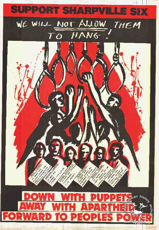SUPPORT SHARPEVILLE SIX : WE WILL NOT ALLOW THEM TO HANG! : DOWN WITH PUPPETS : AWAY WITH APARTHEID : FORWARD TO PEOPLES POWER |