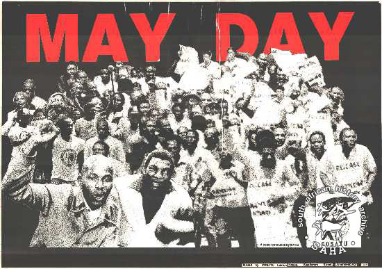 This offset litho poster, showing a black and white photograph of workers with the caption: "MAY DAY" in red, was issued by the Congress of South African Trade Unions (COSATU) in 1986. |