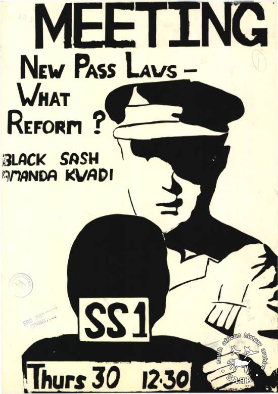 This is a silkscreened poster in black and white issued by the Black Sash and SRC Projects Committee in protest of the new Pass Law. |
