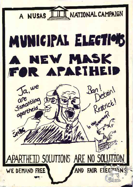 0269 :: A NUSAS National Campaign: Municipal Elections: A New Mask For Apartheid: Apartheid Solutions are no Solution: We Demand Free and Fair