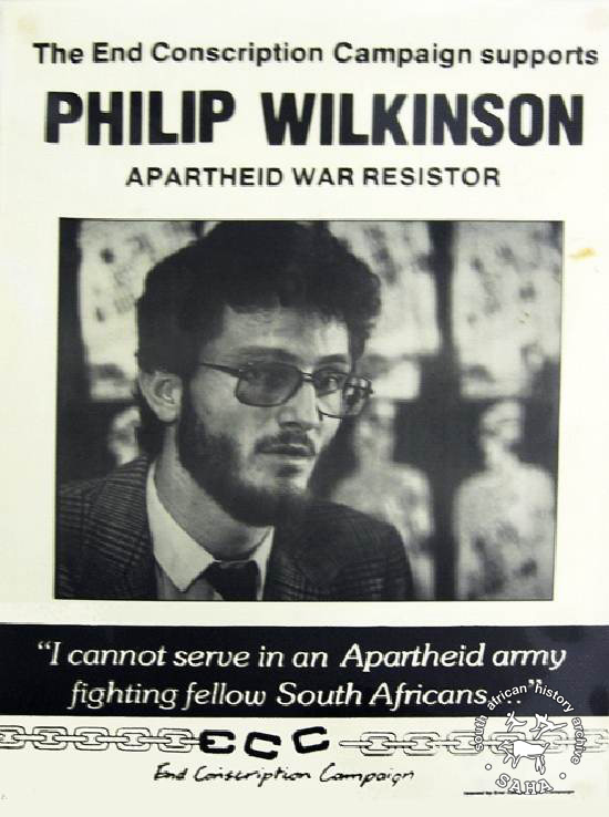 The End Conscription Campaign supports PHILIP WILKINSON: APARTHEID WAR RESISTOR: "I cannot serve in an Apartheid army fighting fellow South Africans...." |