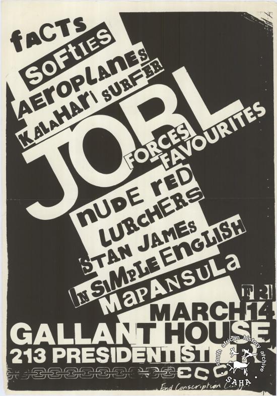 This is a silkscreened poster in black and white, issued by the End Conscription Campaign (ECC) for a concert at Gallant House, 213 President Street on Friday, 14 March, year unknown. The text reads: "FACTS : SOFTIES : AEROPLANES : KALAHARI SURFER : JORL : FORCES FAVOURITES : NUDE RED : LURCHERS : STAN JAMES : IN SIMPLE ENGLISH : MAPANSULA". This poster was digitised by Specialised Archival Solutions in 2009. Included in the SAHA physical and virtual exhibitions 'What you won't hear on the radio' developed to mark the 30th birthday of Shifty Records and the 25th anniversary of the Voƫlvry tour. |