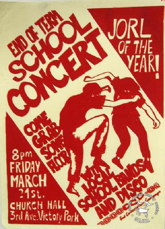 This poster is silkscreened red, produced by the ECC at the STP, Johannesburg. This poster advertises an anti-military 'jorl' (party) for school pupils in the white areas of Johannesburg. The text reads “END OF TERM SCHOOL CONCERT: COME GRAB SOME FLOOR WITH LOCAL SCHOOL BANDS AND DISCO: JORL OF THE YEAR!”Digitised by Specialised Archival Solutions in 2009. Reproduced in "Images of Defiance: South African Resistance posters in the 1980s" on page 112 (number 204) of the 1991 SAHA / Ravan Press edition and the 2004 SAHA / STE Publishers edition. |