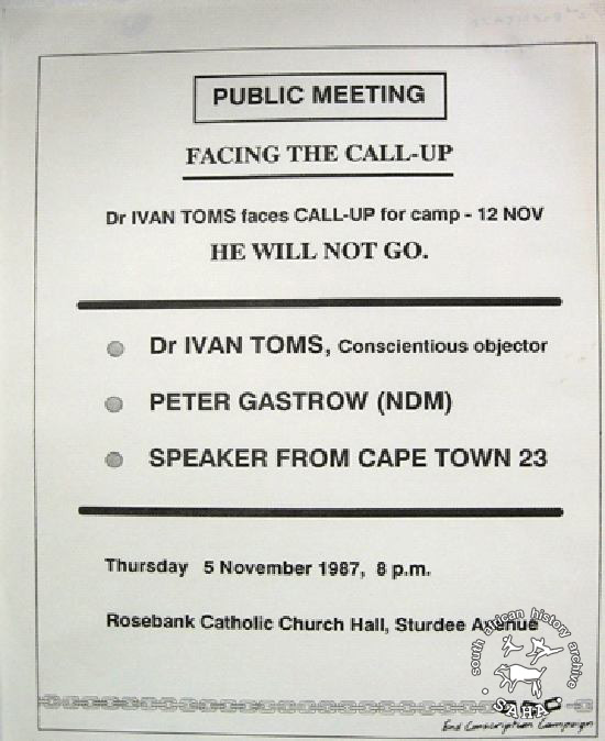 This offset litho poster in black and white was issued by the End Conscription Campaign (ECC) in 1987 and the text reads: "PUBLIC MEETING: FACING THE CALL-UP: Dr IVAN TOMS faces CALL-UP for camp - 12 NOV HE WILL NOT GO." This poster was digitised by Specialised Archival Solutions in 2009.