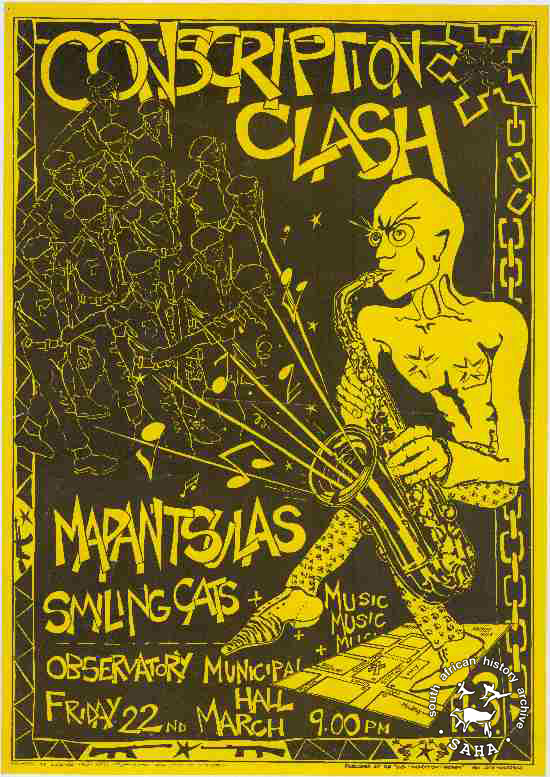 This poster is an offset litho in black and yellow, produced by the ECC, Cape Town. This poster was produced to advertise the music of the resistance, which was believed to overcome militarisation. . The text reads “CONSCRIPTION CLASH: MAPANTSULAS: SMILING CATS” Digitised by Specialised Archival Solutions in 2009. Reproduced in "Images of Defiance: South African Resistance posters in the 1980s" on page 167 (number 303) of the 1991 SAHA / Ravan Press edition and the 2004 SAHA / STE Publishers edition. |