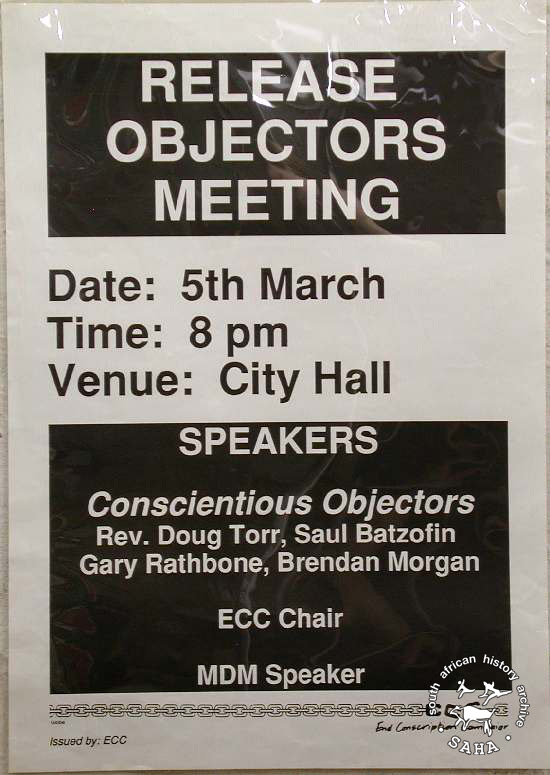 This is an offset litho poster in black and white.The poster announces a Release Objectors Meeting. |