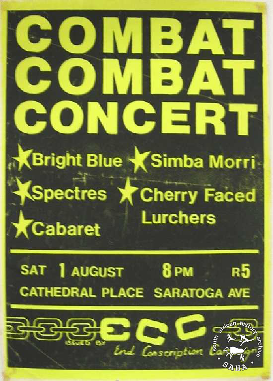 This is a silkscreened poster in yellow and black, issued by the End Conscription Campaign (ECC) for the Combat Concert at Cathedral Place, Saratoga Avenue on Saturday, 1 August, year unknown. The text reads: "COMBAT COMBAT CONCERT : Bright Blue : Simba Morri : Spectres : Cherry Faced Lurchers ". This poster was digitised by Specialised Archival Solutions in 2009. Included in the SAHA physical and virtual exhibitions 'What you won't hear on the radio' developed to mark the 30th birthday of Shifty Records and the 25th anniversary of the Voƫlvry tour. |