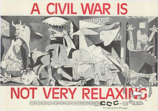This poster is an offset litho in black and red, produced by the ECC, Johannesburg. This poster uses the image of Picasso's 'Guernica', created to express his anguish at the Spanish Civil War, as a means of bringing home the horror of civil strife in South Africa. The text reads: "A CIVIL WAR IS NOT VERY RELAXING". This poster was digitised by Specialised Archival Solutions in 2009. Reproduced in "Images of Defiance: South African Resistance posters in the 1980s" on page 129 (number 227) of the 1991 SAHA / Ravan Press edition and the 2004 SAHA / STE Publishers edition. It also appears on page 184 of “Red on Black: The Story of the South African Poster Movement”, SAHA / STE Publishers, 2007, as well as the SAHA virtual exhibition - 'The Future is Ours: Commemorating Youth in the Struggle'. |