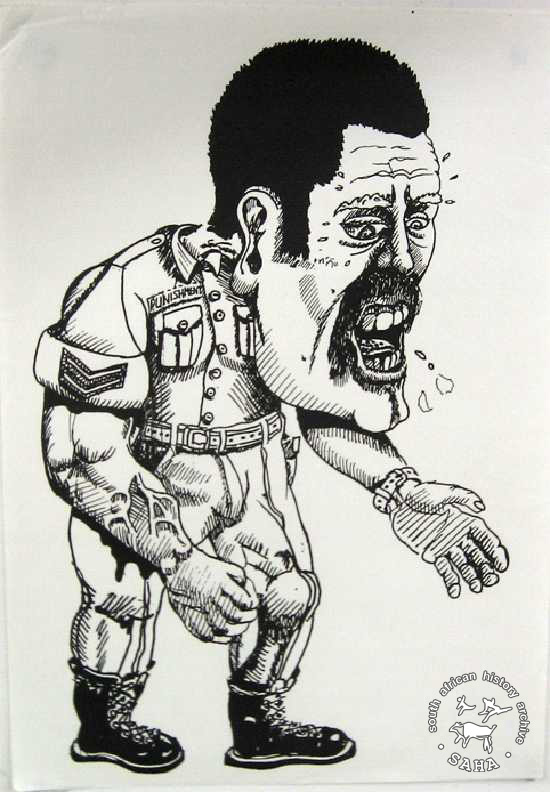 This is a silk screened poster in black and white; with a comic drawing of man in army uniform; [looks a bit like Lucas Mangope] |