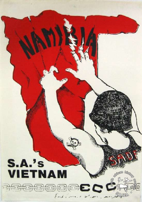 This poster is silkscreened black and red, produced by the ECC, Johannesburg. This poster protests the SADF's role in Namibia, and points out parallels with the USA's Involvement in Vietnam. The text reads “NAMIBIA, S.A.'S VIETNAM” Digitised by Specialised Archival Solutions in 2009. Reproduced in "Images of Defiance: South African Resistance posters in the 1980s" on page 136 (number 245) of the 1991 SAHA / Ravan Press edition and the 2004 SAHA / STE Publishers edition. |