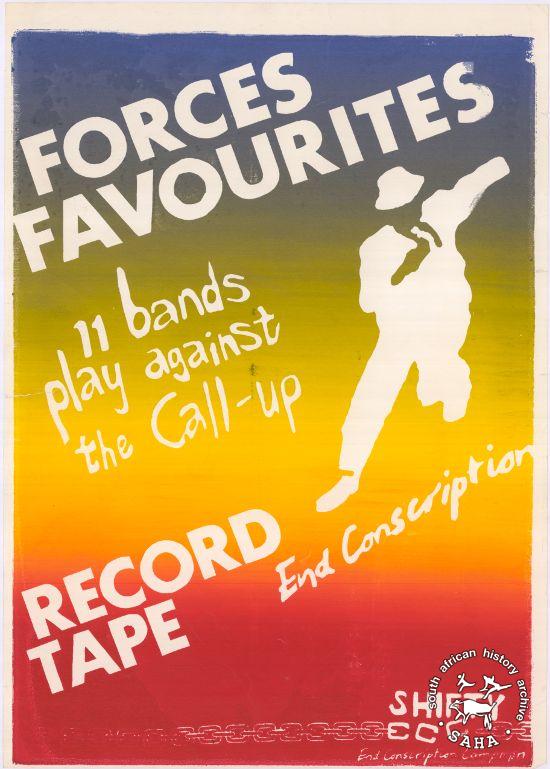 This poster is silkscreened red, yellow and blue, produced at STP by the ECC, Johannesburg. This poster advertised for the release of the compilation album 'Forces Favourites' in conjunction with Shifty Records, 1985. The text reads: "FORCES FAVOURITES : 11 bands play against the Call-up : RECORD TAPE" This poster was digitised by Specialised Archival Solutions in 2009. Reproduced in "Images of Defiance: South African Resistance posters in the 1980s" on page 165 (number 296) of the 1991 SAHA / Ravan Press edition and the 2004 SAHA / STE Publishers edition. It has also been included in the SAHA virtual exhibition 'What you won't hear on the radio' developed to mark the 30th birthday of Shifty Records and the 25th anniversary of the Voƫlvry tour. |