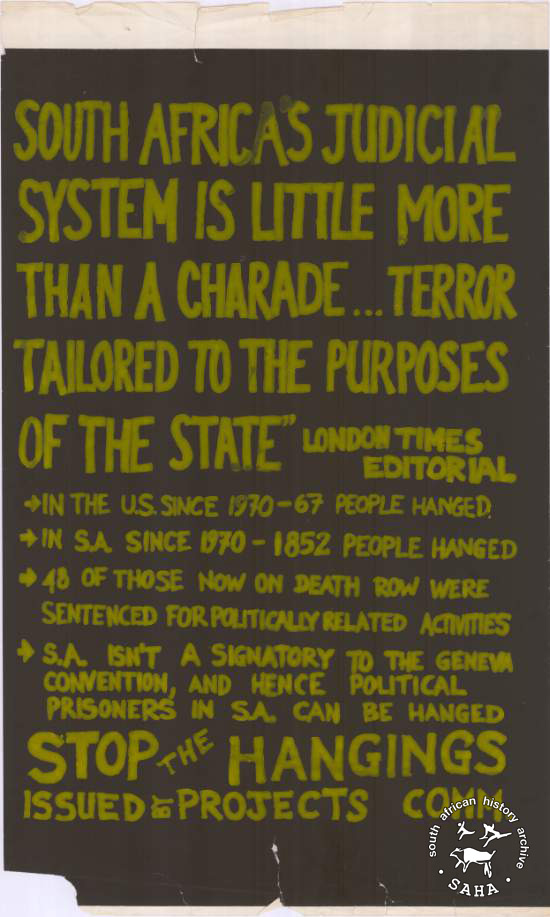 This is an offset litho poster in red and black. It was issued by Projects Committee, University of the Witwatersrand in protest against the death penalty by hanging of political prisoners. |