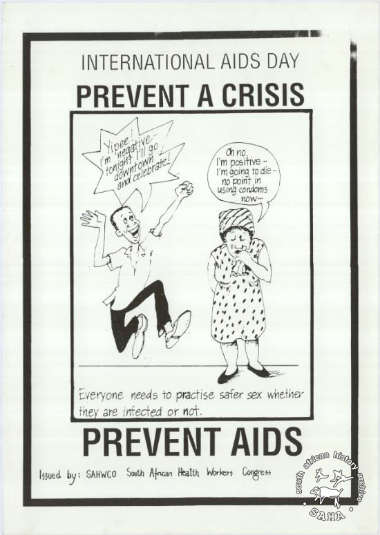 This is a silk srceened poster in black and white. It was issued by the South African Health Workers Congress (SAHWCO) on International AIDS Day |