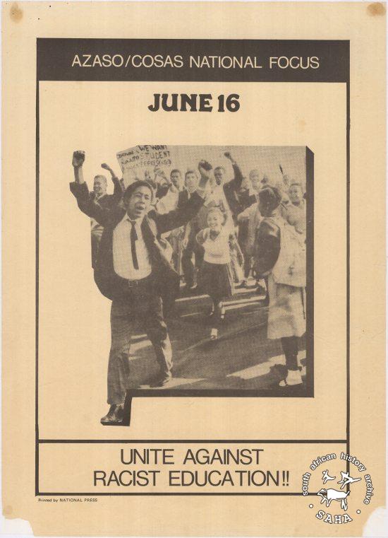 This poster is an offset litho in black and white. The text reads: "AZASO/COSAS NATIONAL FOCUS : JUNE 16 : UNITE AGAINST RACIST EDUCATION".