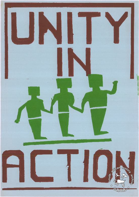 This is a silkscreened poster in brown and green on blue. The text reads: "Unity in action". Date unknown.