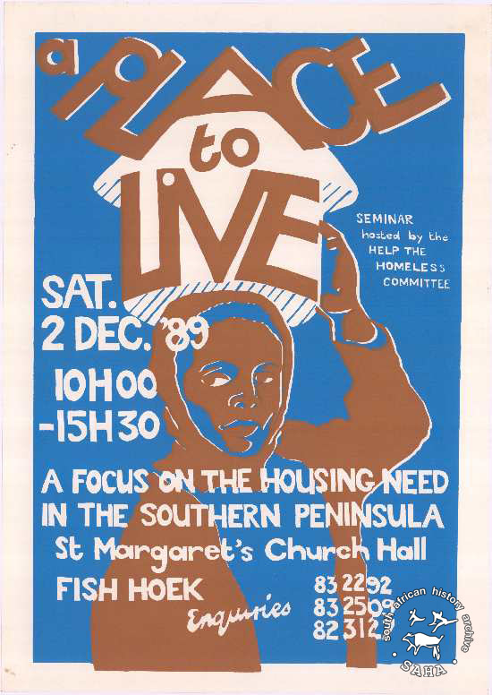 This poster is silkscreened blue and brown, produced by the Help the Homeless Committee at CAP, Cape Town. This poster relates to a notice of a seminar on housing and the homeless question in the Western Cape. The text reads “A PLACE TO LIVE: A FOCUS ON THE HOUSING NEED IN THE SOUTHERN PENINSULA St Margaret's Church Hall”Digitised by Specialised Archival Solutions in 2009. Reproduced in "Images of Defiance: South African Resistance posters in the 1980s" on page 84 (number 150) of the 1991 SAHA / Ravan Press edition and the 2004 SAHA / STE Publishers edition. |