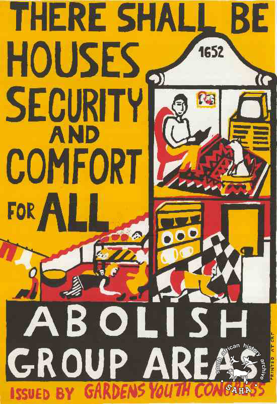 This poster is silkscreened black, red and yellow, produced by GAYCO at the CAP, Cape Town. This poster was produced by a youth congress, who were based in a white area. This congress opposed the Group Areas Act and popularised the Freedom Charter's call for houses for all. The text reads “THERE SHALL BE HOUSES SECURITY AND COMFORT FOR ALL: ABOLISH GROUP AREAS”Digitised by Specialised Archival Solutions in 2009. Reproduced in "Images of Defiance: South African Resistance posters in the 1980s" on page 85 (number 151) of the 1991 SAHA / Ravan Press edition and the 2004 SAHA / STE Publishers edition. It also appears on page 91 of “Red on Black: The Story of the South African Poster Movement”, SAHA / STE Publishers, 2007. |