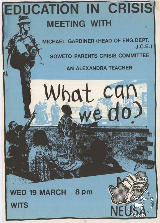 EDUCATION IN CRISIS : MEETING WITH MICHAEL GARDINER (HEAD OF ENG.DEPT. J.C.E.) SOWETO PARENTS CRISIS COMMITTEE AN ALEXANDRA TEACHER : WHAT CAN WE DO? |