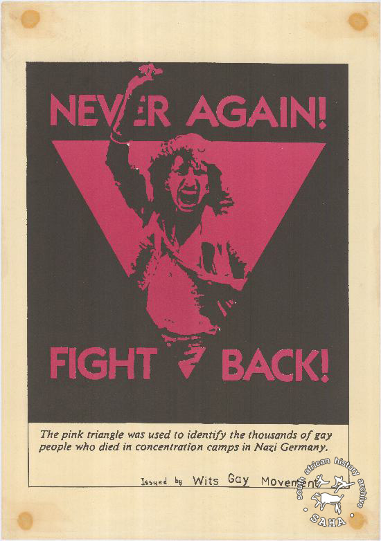 This poster is an offset litho in black and pink. It features an image of a woman with her fist raised inside an inverted pink triangle. The text reads: "NEVER AGAIN! : FIGHT BACK! : The pink triangle was used to identify the thousands of gay people who died in concentration camps in Nazi Germany. : Issues by Wits Gay Movement".