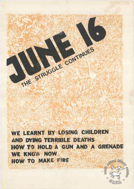 This silkscreened poster in black and yellow was produced by the Medu Arts Ensemble. The text reads: "JUNE 16 : THE STRUGGLE CONTINUES : WE LEARNT BY LOSING CHILDREN AND DYING TERRIBLE DEATHS HOW TO HOLD A GUN AND A GRENADE : WE KNOW NOW HOW TO MAKE FIRE".