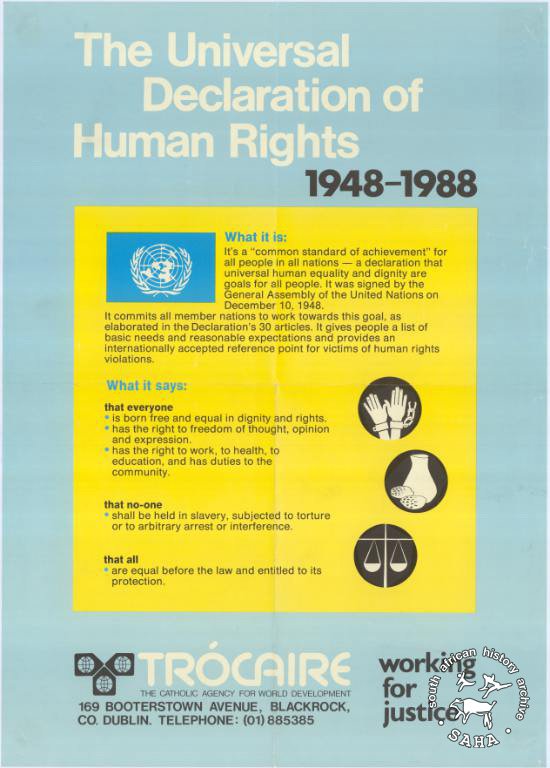 This is an offset litho poster in black, blue and yellow. It was issued by Catholic Agency for World Development in commemoration of the Universal Declaration of Human Rights 1948. |