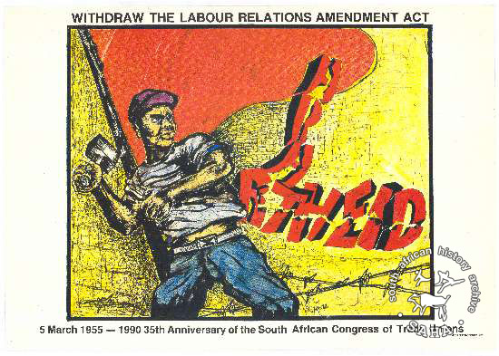 This is an offset litho poster in full colour. It was issued by the South African Congress of Trade Unions (SACTU) against the Labour Relations Amendment Act, and the text reads: "WITHDRAW THE LABOUR RELATIONS AMENDMENT ACT: 5 March 1955 1990 35th Anniversary of the South African Congress of Trade Unions".