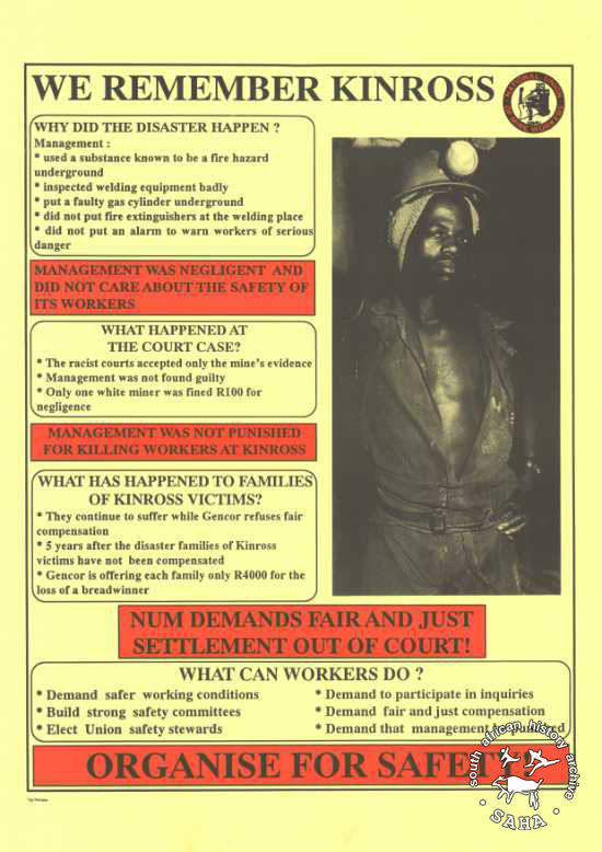 We remember Kinross: NUM demands fair and just settlement out of court: organise for safety. |