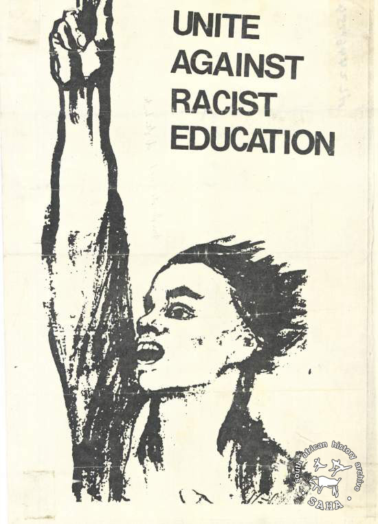 This is an off set litho poster in black and white with a drawing of a man holding one arm upright with the caption: "Unite against racist education". This poster was digitised by Specialised Archival Solutions in 2009. |
